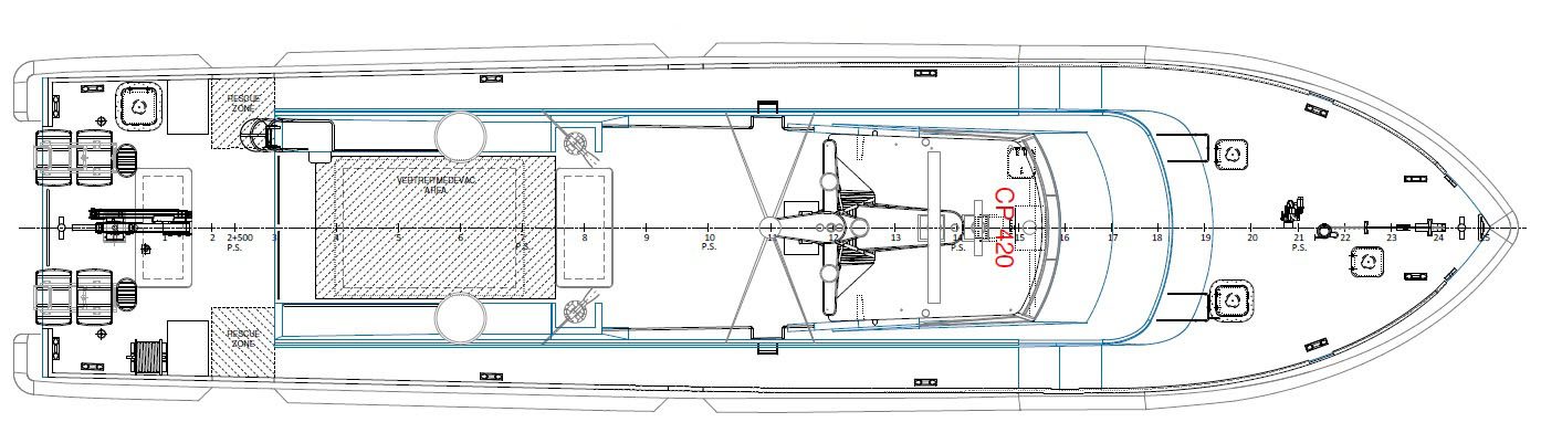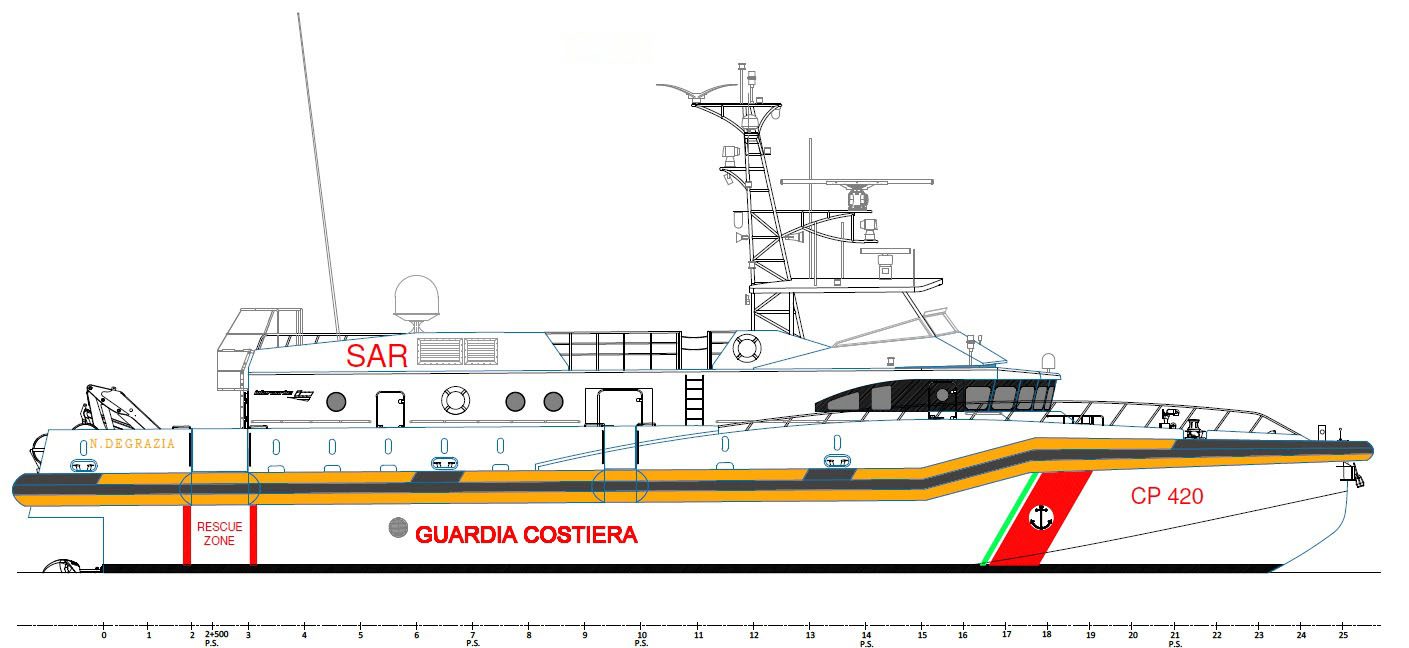 The main features are a significant operational range, accommodation for 10 crew members and a wide covered space equipped with a suitable sick bay for first aid, available for hosting up to 50 rescued persons.